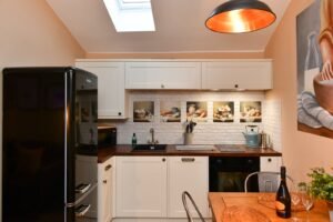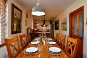 A spacious two-level barn for 3, featuring a double bed on the open-plan mezzanine, that can be split into 2 singles, plus a single trundle bed – perfect for families or friends. Enjoy sea views from the upstairs Velux and the glass-fronted stable door. The rear garden offers a courtyard patio with gas BBQ and lovely countryside views. Pet-friendly